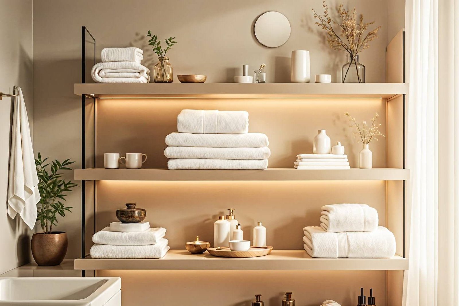 Un baño que combina líneas limpias, texturas suaves y el frescor de la naturaleza.